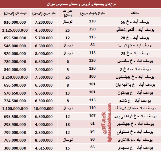 قیمت آپارتمان در یوسف‌آباد تهران (جدول)