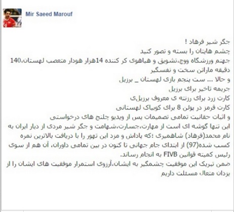 عصر ایران – سعید معروف داور ایرانی را به «فرهاد» تشبیه کرده. کاپیتان تیم ملی والیبال که از حاشیه های بازی برزیل و لهستان با خبرشده حسابی از کارویژه داور ایرانی به هیجان آمده است. دردیدار نهایی مرحله گروهی مسابقات والیبال وقتی که برزیل و روسیه دریک گروه برای صعود می جنگیدند حساسیت بازی سبب درگیری های لفظی فراوان و اعتراض های بی اندازه به داوری مسابقه شده. داور مسابقه هم کسی نبوده جز داور بین المللی ایرانی محمدشاهمیری . او در این بازی تصمیمات جنجال برانگیزی گرفته که سبب افزایش اعتراض ها شده. اما نکته مهم اینجاست که همه ویدیوچلنج ها ثابت کرد تصمیمات داور درست بوده.همین سبب شده چند روز بعد از بازی سعید معروف نسبت به داوری فوق العاده شاهمیری عکس العمل نشان دهد.