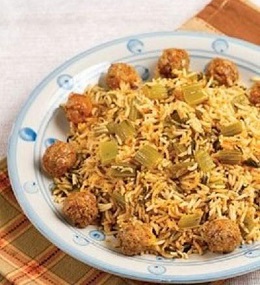 کرفس و گوشت لابهلای پلو ریخته و کمی پودر لیمو امانی نیز میپاشیم. در