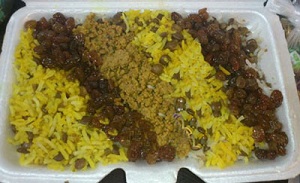 میتوانید برنج را در ظرفها ریخته و روی آن گوشت، پیازداغ، کشمش سرخ شده