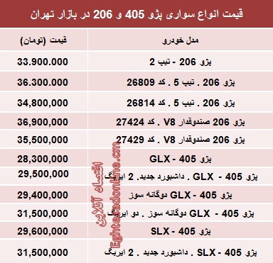 قیمت روز انواع مدل‌های پژو 405 و ‌206‏ (جدول)