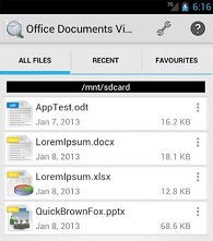 Office Documents Viewer نرم افزار اندروید Office Documents Viewer از تمام فرمت های متنی مانند Doc و Docx و ODT و SXW و از فرمت اکسل یا همان XLSx و فرمت پاورپوینت pptx و فرمت های رایج دیگر مانند پی دی اف و اچ تی ام ال و RTF و CSV و … پشتیبانی می کند. با این ویژگی ها و این حجم و سادگی بی شک یکی از بهترین برنامه های ویرایش و مشاهده سریع متن همین برنامه است.