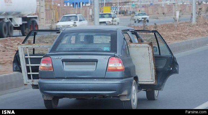 تصویر زیر، یک پراید را که در حال حمل یک در آهنی بزرگ است، در کمربندی کرمان نشان می‌دهد. این عکس را «پارسینه» منتشر کرده است.