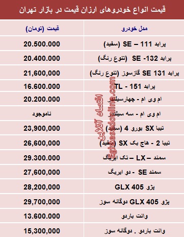 قیمت روز خودروهای صفر ارزان‌ قیمت بازار تهران که کمتر از 30 میلیون تومان قیمت خورده به شرح جدول زیر است: