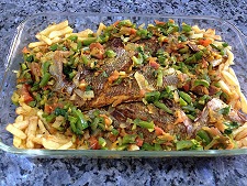 روى ماهى را با سيب زمينى و سبزيجات كه از قبل آماده كرديد تزيين كنيد و دوباره به مدت 5 دقيقه ديگر در فر بگذاريد.