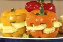 کدوی ورقه شده را یک در میان از لای برشهای فلفل دلمه ای رد کنید .