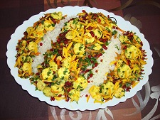 برنج که دم کشید مواد آماده شده را لا به لای برنج یا روی برنج تزئین کنید .