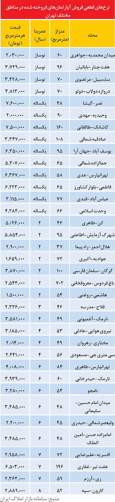 از سوی دیگر 2 میلیون و 200 هزار تومان ارزش هر متر مربع واحدی 6 ساله به متراژ 45 متر مربع در خیابان ولیعصر شمالی است، البته این واحد روز پیش در بازار خرید و فروش معامله شد. خریداری در حوالی میدان محمدیه بابت خرید یک واحد مسکونی 60 متری نوساز در ازای هر متر ، 2 میلیون و 30 هزار تومان به فروشنده پرداخت کرد.