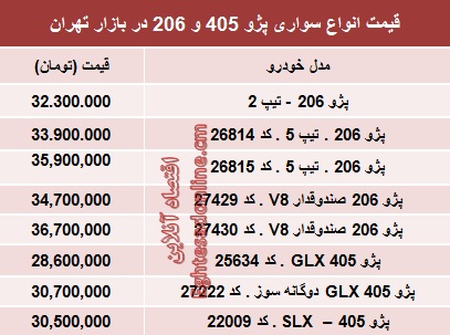 قیمت انواع پژو 405 و ‌206‏ (جدول)