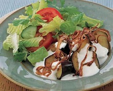ماست، شیر و سیر را با یکدیگر مخلوط کنید و آنها را روی بادمجانها بریزید.