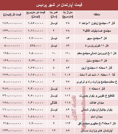 قیمت مسکن در شهر جدید پردیس (جدول)