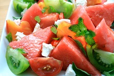 سالاد از چند رنگ و اندازه های متفاوت گوجه استفاده کنید. هندوانه را به