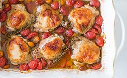 مخلوط گوجه گیلاسی ها را روی تکه های مرغ و اطرافشان بریزید. ما می خواهیم پوست مرغ داخل فر قهوه ای رنگ شود. در آخر رزماری ها را روی گوجه بگذارید. (اگر از رزماری خشک استفاده می کنید، آن ها را با گوجه ها مخلوط کنید)