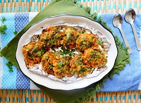 در یک کاسه خمیر نخود را ریخته ، پیاز، فلفل سبز، گشنیز، برگ کاری و نمک را مخلوط کنید تا یکدست شود.