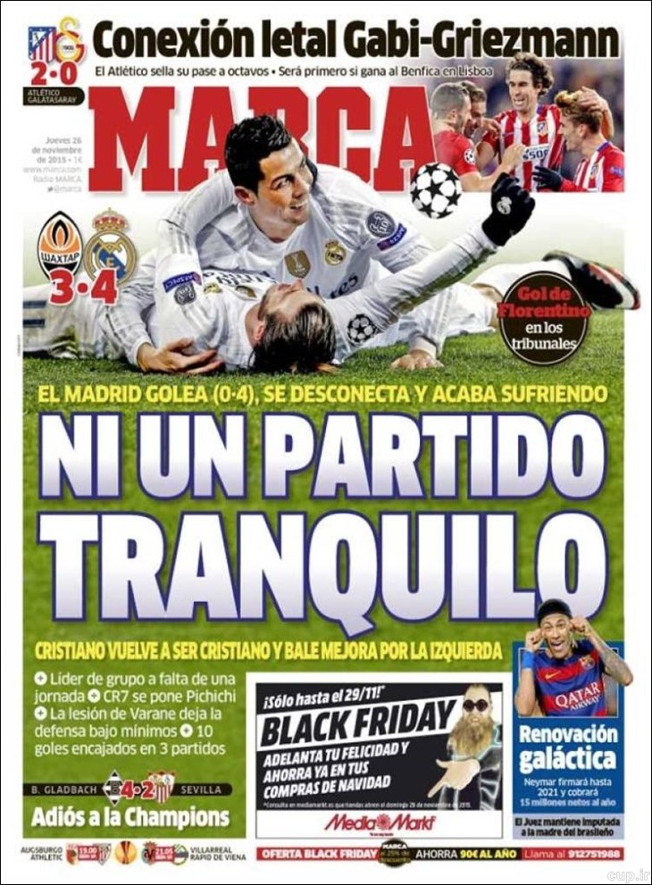 به گزارش کاپ، روزنامه هواداری رئال مادرید، مارکا، در نسخه چاپی امروز از تیتر دریغ از یک بازی آرام وراحت استفاده کرده و اشاره ب بهرد 4 بر 3 رئال مقابل شاختار در لیگ قهرمانان دارد. این روزنامه در توضیح تیترش نوشته: رئال اول 0-4 پیش افتاد و بعد ازتلاش دست کشید و در پایان بازی سختی های زیادی را متحمل شد. این روزنامه همچنین به درخشش بیل و رونالدو هم اشاره کرده است: رونالدو دوباره رونالدو شده بود و بیل سمت چپ را پرقدرت تر کرده بود.