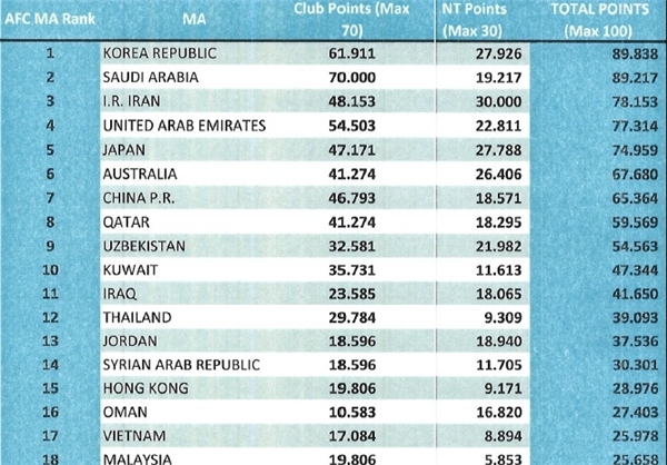 بنابراین رنکینگ فوتبال ایران با کسب امتیاز کامل 30 از بخش ملی و 48،153 در ردهبندی باشگاهی با مجموع 78،153 در رده سوم قاره کهن و پس از فوتبال کشورهای کرهجنوبی و عربستان و بالاتر از امارات ژاپن قرار دارد.