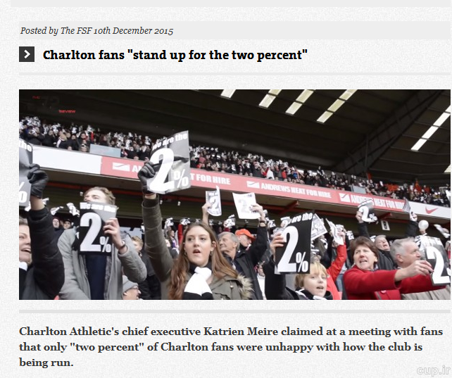 سایت لندن24در این باره گزارش داد فقط 2 در صد هواداران تیم چارلتون از نتایج این تیم ناراضی هستند و آنها معمولا جو ورزشگاه والی لندن را بر علیه یاران رضا قوچان نژاد متشنج می کنند.پس از این گزارش بود که هواداران چارلتون با پلاکاردهای 2درصدی به استادیوم آمدند تا نشان دهند که خیلی بیش از آنچه هستند که سایت لندن 24 مدعی شده است.