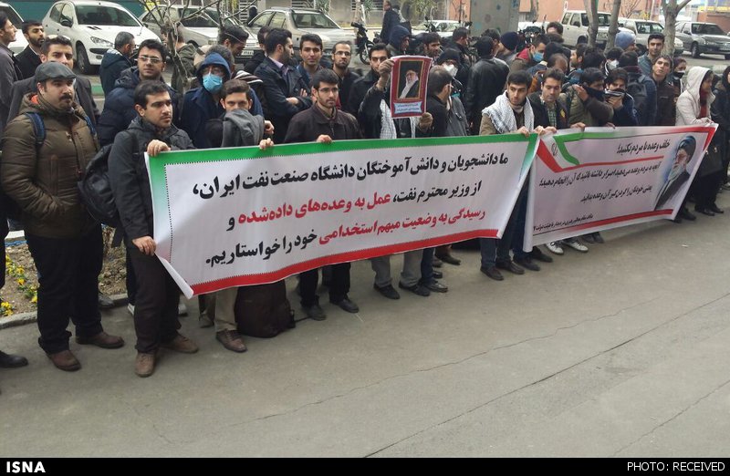 تعدادی از فارغالتحصیلان و دانشجویان دانشگاه صنعت نفت، در اعتراض به ابلاغیه وزیر نفت مبنی بر ممنوعیت هرگونه استخدام و جذب نیروی انسانی، مقابل ساختمان این وزارتخانه در خیابان حافظ تجمع کردند.