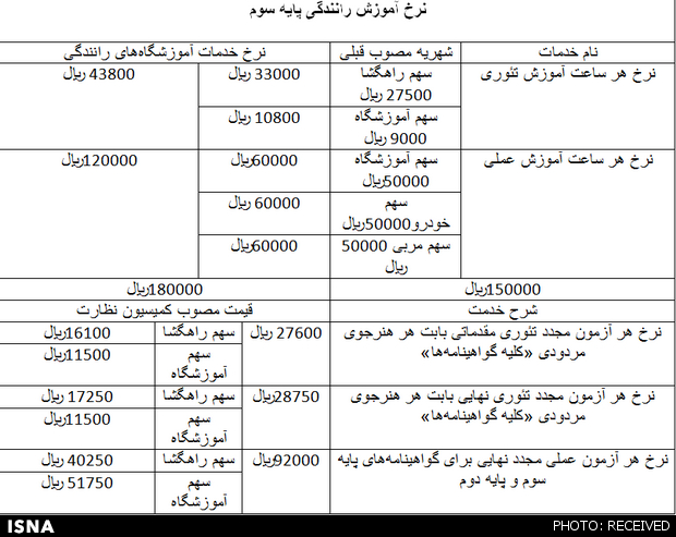 به گفته وی، هر ساعت آموزش عملی رانندگی 15 هزار تومان بود که به 18 هزار تومان افزایش یافته است و هر ساعت آموزش تئوری رانندگی از 3650 تومان شهریه مصوب قبلی به 4380 تومان تغییر قیمت داده است.
