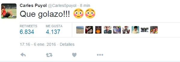 واکنش کارلس پویول، کاپیتان سابق و یکی از اسطوره های بارسلونا به سوپرگل مسی از روی ضربه کاشته بامزه بود. او دقایقی پس از ثبت گل مسی، در توئیتر خود با گذاشتن شکلک های زیر نوشت "چه گل زیبایی."