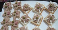 نان تست ها را برش زده كمی كره روی آن می ماليم و مواد را روی آن می ريزيم، سپس با نخود فرنگی تزئين می كنيم.