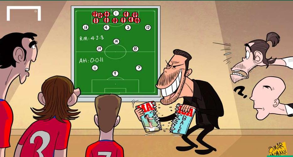 روز گذشته دیگو سیمئونه که تاکتیک هایش مورد انتقاد برخی کارشناسان و رسانه ها قرار دارد، در نشست خبری خود به شوخی گفت که در بازی فینال، دست از فلسفه دفاعی اتلتیکو برداشته و تیمش را با 11 مهاجم و تاکتیک 11-0-0 به مصاف رئال خواهد فرستاد!عمر مومانی هم این مساله را سوژه کارتون امروزش قرار داده است.