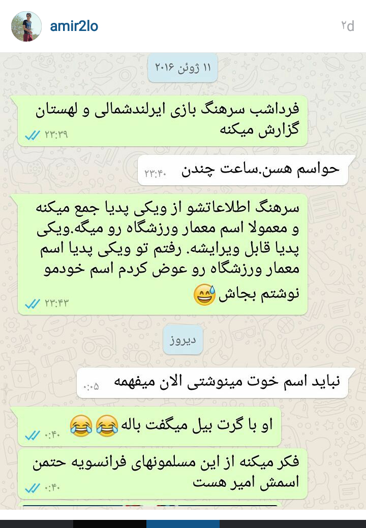 من میدانستم که سرهنگ علیفر اطلاعاتش را از ویکی پدیا به دست میآورد که اصلا معتبر نیست، برای همین شب قبل از بازی ایرلند، با دوستم در واتس آپ چت می کردم، قرار شد در نام ورزشگاه تغییر ایجاد کنم. هدف خاصی هم نداشتم و فکر نمیکردم که سرهنگ علیفر از آن استفاده کند.