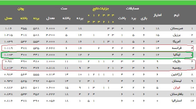 با توجه به این نکات 4 تیم رقیب ایران هستند که فقط با یکی شان که همان ایتالیا باشد بازی مستقیم داریم. فرانسه و ایتالیا 4 بردی هستند و بلژیک و روسیه 3 بردی. همه تیم ها 3 بازی باقیمانده دارند و دوتیم اول باکسب 2 پیروزی برای ایران غیرقابل دسترس می شوند و 2 تیم بعدی به 3 پیروزی نیاز دارند تا از ایران در امان باشند.