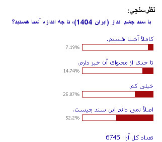در نظرسنجی عصرایران این سوال مطرح شده بود که " با سند چشم انداز (ایران 1404) تا چه اندازه آشنا هستید؟" که در آن 6745 نفر شرکت کردند و تنها حدود 7 درصد گزینه "کاملا آشنا هستم" را انتخاب کردند.