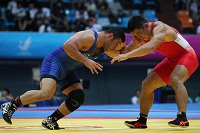 رضا یزدانی کاپیتان تیم ملی کشتی آزاد در دور نخست وزن ۹۷ کیلوگرم با "ابراهیم بلوکباشی" از ترکیه مبارزه می کند.