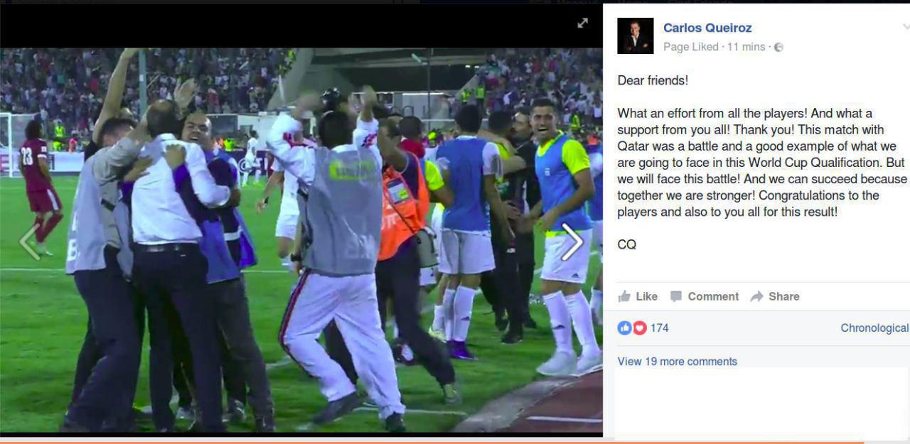 کی روش در این پست نوشته است : چه تلاشی از همه بازیکنان ! و چه حمایتی از سوی شما ! متشکرم . بازی قطر مثالی از آن چیزی است که در رقابتهای مقدماتی جام جهانی اتفاق خواهدافتاد و ما با این چالش رودررو خواهیم شد . ما موفق می شویم چرا که با هم قوی تریم. تبریک به همه بازیکنان و البته شما بابت این نتیجه.