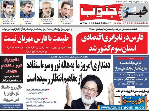 به گزارش توریسم آنلاین، نکته جالب تعداد صفحات روزنامه امروز "خبر جنوب" است؛ 36 صفحه + 8 صفحه ضمیمه ادبی نگاه پنج شنبه این روزنامه و این در حالی است که کشورمان یک روز نیمه تعطیل را سپری می کند.