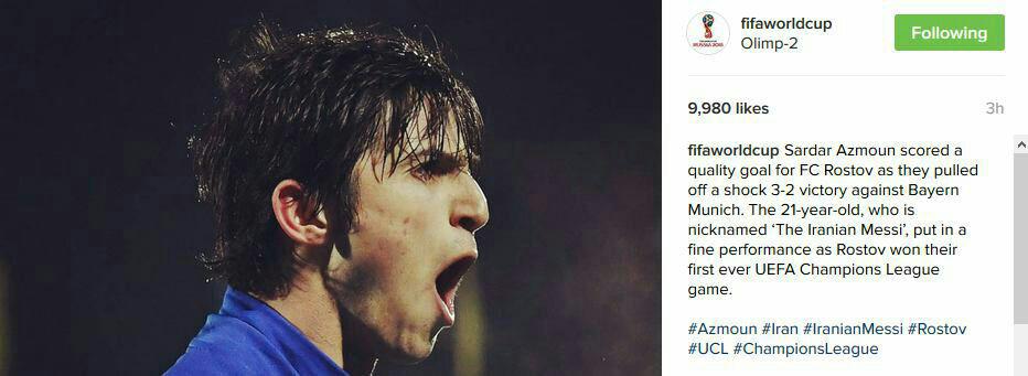 صفحه رسمی اینستاگرام فیفا به گلزنی و درخشش سردار آزمون مقابل بایرن مونیخ واکنش نشان داد/ "مسی ایرانی" ستاره این روزهای روستوف