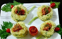 سیب زمینی را با پوست آبپز کرده و تا گرم هست پوست آن را بگیرید و له کنید و پوره می کنیم و نصف کره، نمک، جعفری ساطوری شده و فلفل و زرده تخم مرغ مخلوط کرده و هم می زنیم تا داغی سیب زمینی باعث آب شدن کره شود بعد پوره را داخل قیف ماسوره دار ریخته و کف سینی فر را کاغذ روغنی انداخته و به شکل دایره تو خالی (تقریبا شبیه لانه پرنده) از پوره داخل سینی فر که کاغذ روغنی انداختیم می گذاریم.