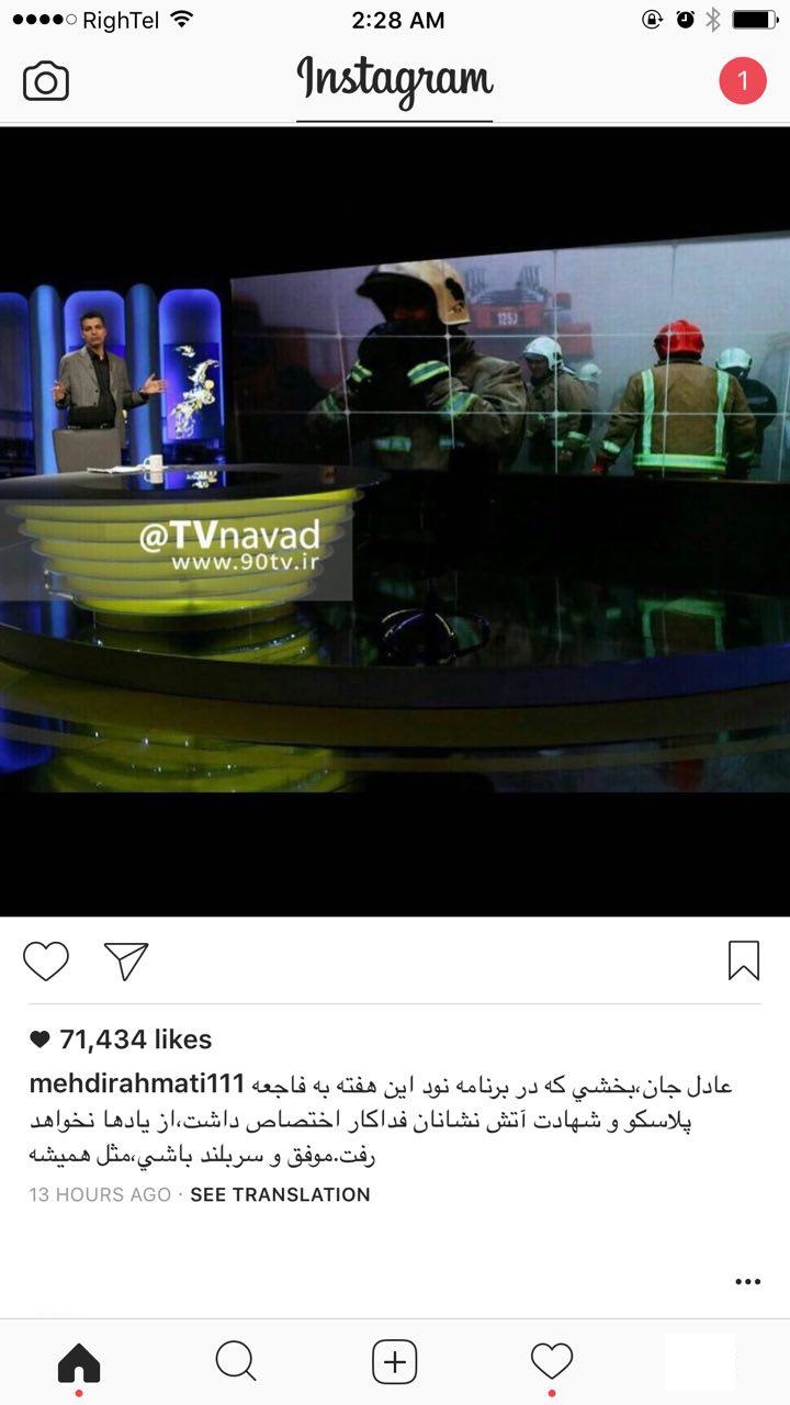 دروازه بان شماره یک استقلال از عادل فردوسی پور برای برنامه ای که در ماجرای پلاسکو تهیه کرده بود حمایت کرد. سیدمهدی رحمتی در صفحه اینستاگرام خود عکسی از برنامه دوشنبه شب نود گذاشت و نوشت :«عادل جان،بخشي كه در برنامه نود اين هفته به فاجعه پلاسكو و شهادت آتش نشانان فداكار اختصاص داشت،از يادها نخواهد رفت.موفق و سربلند باشي،مثل هميشه»