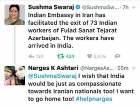نرگس کلباسی، بانوی نیکوکار ایرانی که به اتهام قتل غیرعمد یک کودک هندی در این کشور به سر میبرد، به پیام توییتری وزیر امور خارجه هند مبنی بر ایجاد تسهیلاتی برای خروج ۷۳ کارگر هندی فعال مجتمع فولاد صنعت تجارت آذربایجان و انتقال آنها به هندوستان پاسخ داد.