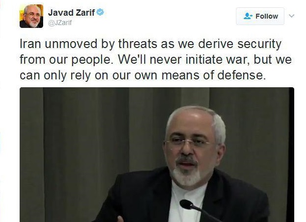 وزیر امور خارجه کشورمان در حساب توئیتری خود نوشت: ما هرگز جنگی را آغاز نمیکنیم اما میتوانیم به ابزارهای دفاعی خود تکیه کنیم.