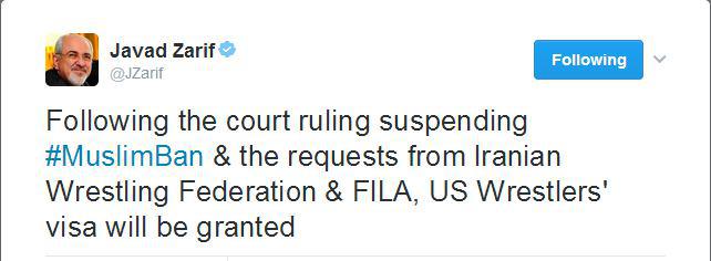 توئیت جدید ظریف: درپی تعلیق قانون ممنوعیت ورود مسلمانان از سوی دادگاه و درخواست‌های فدراسیون کشتی ایران و اتحادیه جهانی به کشتی گیران آمریکا روادید داده می‌شود.