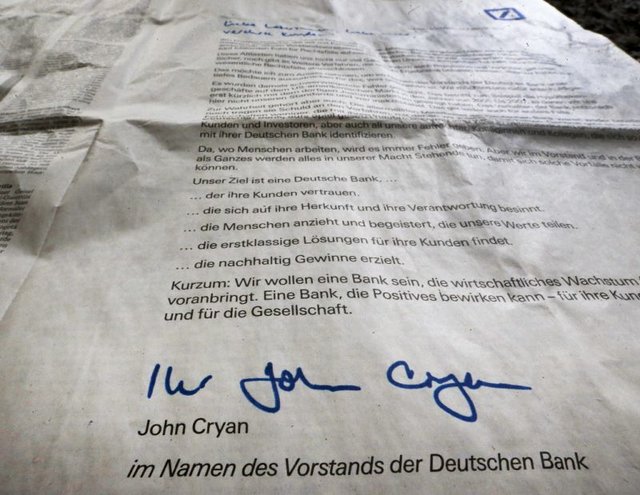 به گزارش ایسنا، این پیام که از سوی جان کریان، مدیرعامل دویچه بانک به نمایندگی از سوی هیات مدیره امضا شد، در روزنامههای فرانکفورتر آلگماینه سایتونگ و زوددویچه سایتونگ به چاپ رسید.