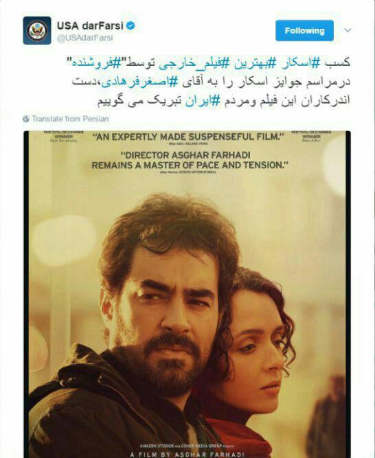 به گزارش ایسنا، صفحه فارسی توییتر وزارت امور خارجه آمریکا در توییتری نوشت: کسب اسکار بهترین فیلم_خارجی توسط"فروشنده" درمراسم جوایز اسکار را به آقای اصغر فرهادی،دست اندرکاران این فیلم و مردم ایران تبریک میگوییم.