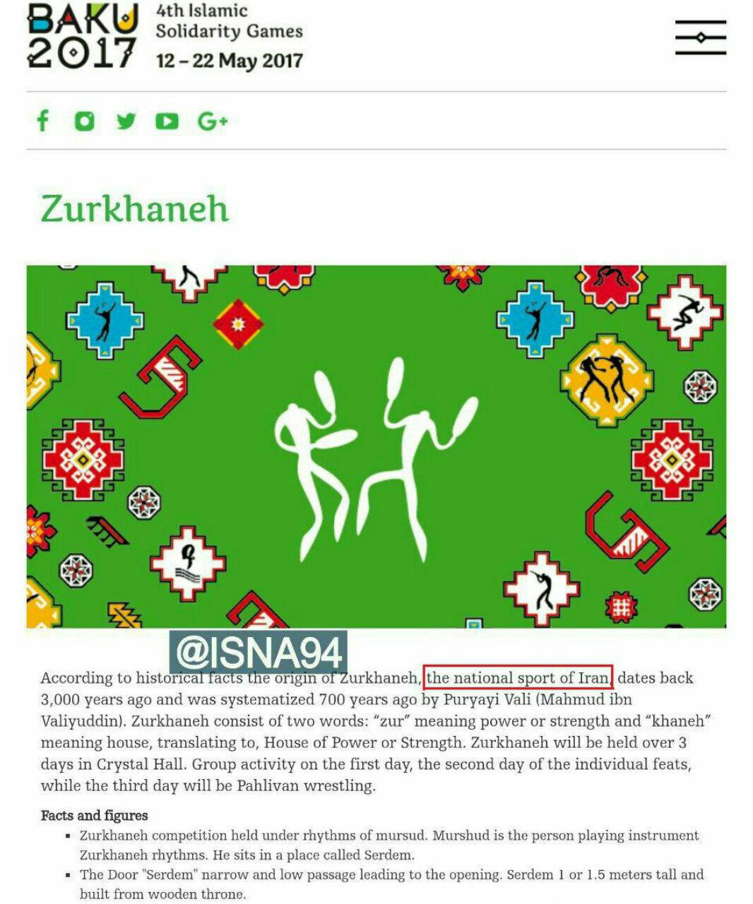 آذربایجان اشتباهش را اصلاح کرد؛ ورزش زورخانه‌ای متعلق به ایران استسایت بازی‌های کشورهای اسلامی باکو 2017 در خبری ورزش زورخانه‌ای را متعلق به کشور ایران دانست.