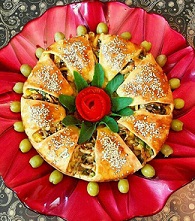 کمی از گوشه ها داخل قالب روی هم می افتد. بعد از اینکه تمام برش های مثلثی خمیر را دور تا دور قالب چیدید مواد میانی را روی خمیر داخل قالب می گذاریم و نوک خمیر که کمی بیرون از قالب بود روی مواد بر می گردانیم بدین طریق حلقه خمیری گرد داخل قالب خواهیم داشت.