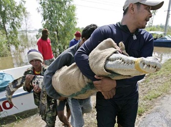 بنا به گفته مقامات باغ وحش بانگوک، این کروکودیل از قفس خود گریخته و با وجود سیل به خیابان های شهر راه یافته بود.