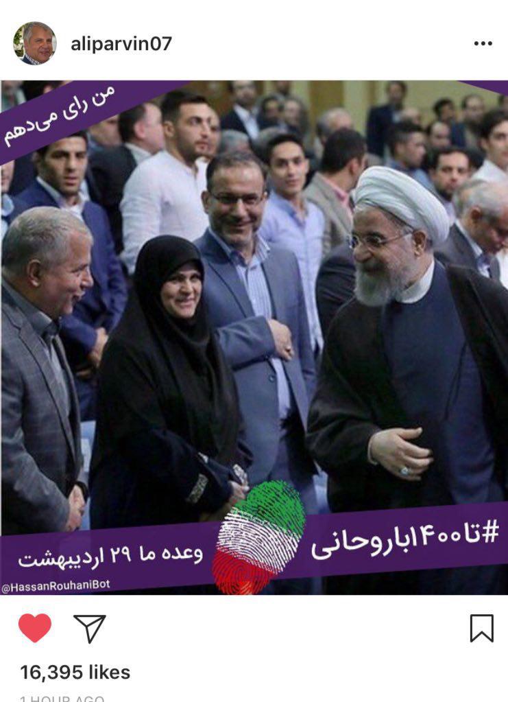 علی پروین با انتشار این عکس در اینستاگرام حمایت خود از حسن روحانی را رسما اعلام کرد.