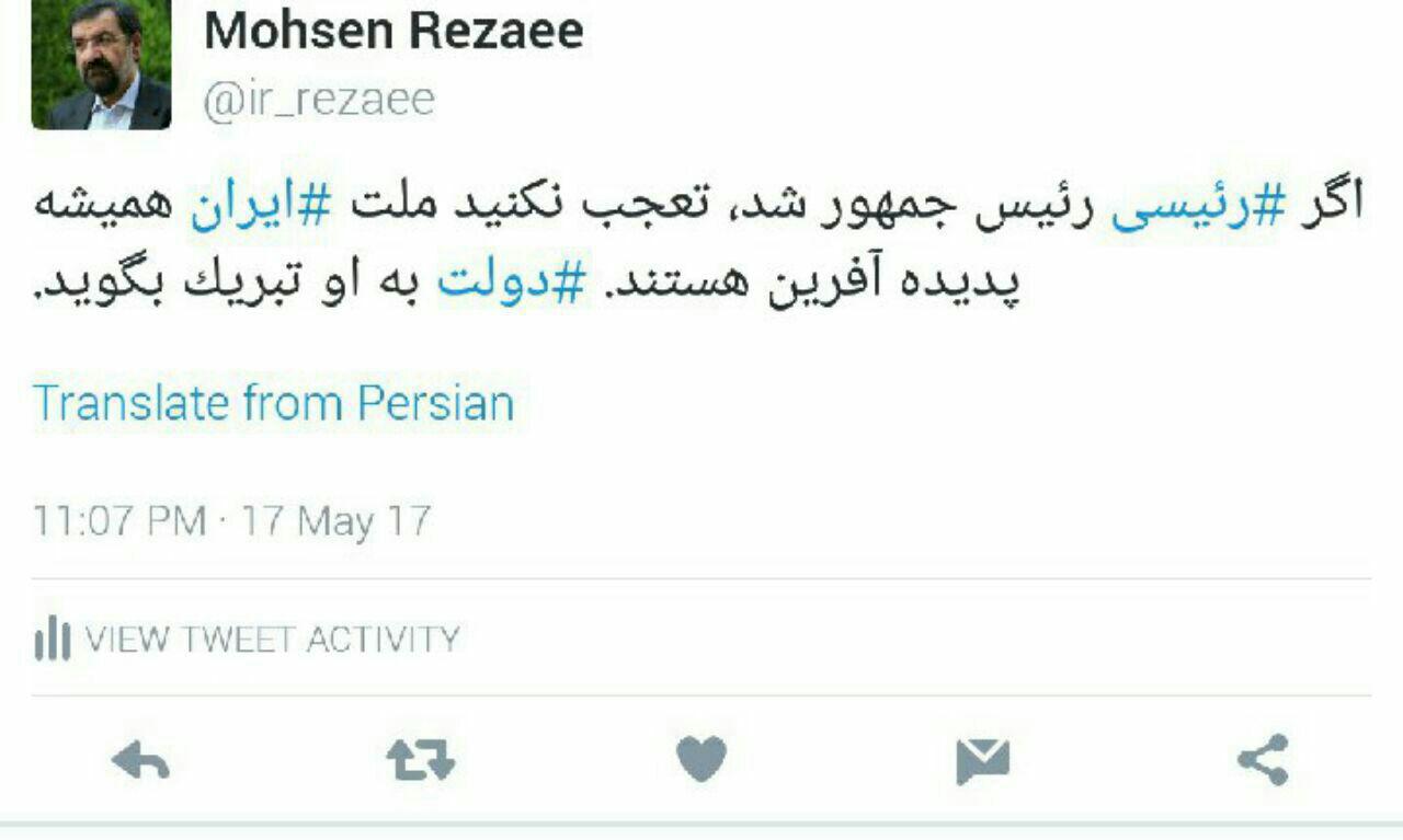 پیش بینی محسن رضایی: رئیسی، رئیس جمهور می شود محسن رضایی : اگر رئيسى رئیس جمهور شد، تعجب نكنيد صفحه رسمی رضایی در توئییتر
