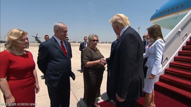 ترامپ در آغاز ورودش به فرودگاه بین المللی بن گوریون در تلآویو مورد استقبال بنیامین نتانیاهو، نخست وزیر و روون ریولین، رئیس رژیم صهیونیستی و جمع از مسئولان ارشد این رژیم قرار گرفت.