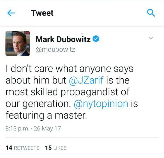 مارک دوبوویتز، یکی از استراتژیستهای آمریکا برای تحریم ایران در توئیتی نوشت: ظریف حرفهای ترین مبلغ نسل ما است.