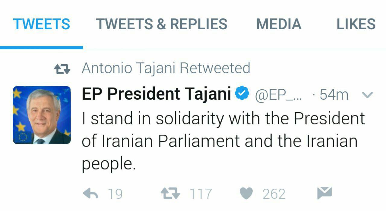 به گزارش ایسنا، آنتونیو تاجانی رئیس پارلمان اروپا با انتشار پیامی در صفحه توئیتر خود نوشت: من با رئیس مجلس و مردم ایران اعلام همبستگی میکنم.