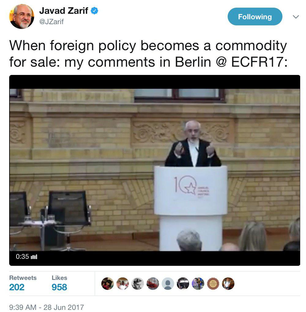 یه گزارش ایسنا، محمدجواد ظریف وزیر خارجه کشورمان در کنفرانس شورای روابط خارجی اروپا (2017) در سخنانی گفت: زمانی که سیاست خارجی به کالایی برای فروش تبدیل میشود در این صورت خرید تجهیزات نظامی معیار شما برای تشخیص تروریسم از غیر تروریسم تبدیل خواهد شد.