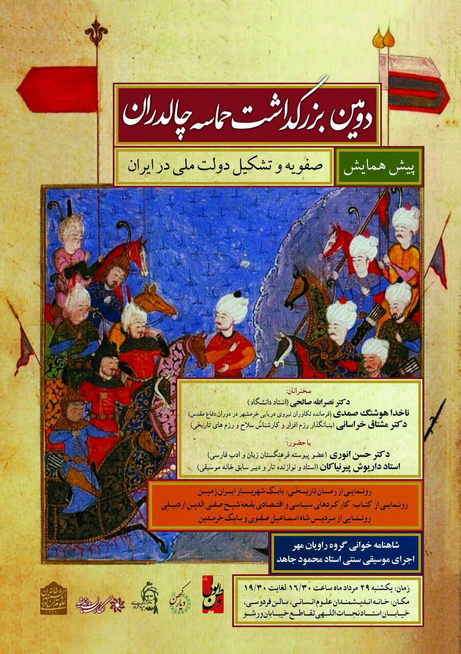 همزمان با بزرگداشت حماسه چالدران، پیش همایش "صفویه و تشکیل دولت ملی در ایران" به همت نشریه وطن یولی (راه وطن) و با همکاری موسسه تاریخی دیار کهن، بنیاد فردوسی، موسسه نگارستان اندیشه و خانه اندیشمندان علوم انسانی در تالار فردوسی برگزار میشود.